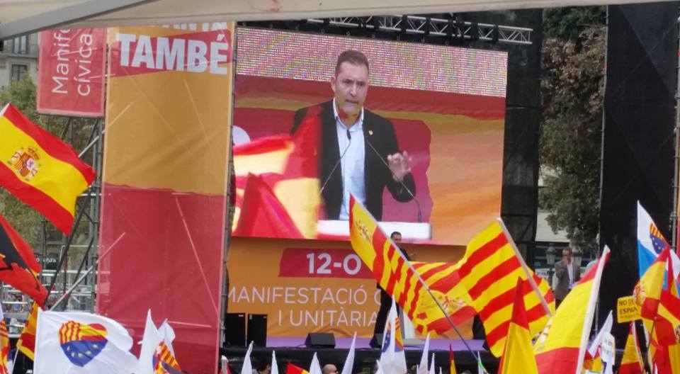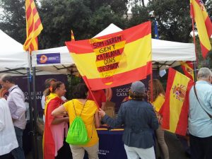 En el acto del 12 de Octubre, todo comienza el día y la noche de antes. Promocionado por redes sociales con facebook, twiter, instagram, etc con el lema Cataluña Sí, España también, desde Movimiento Cívico Espanya i Catalans. Una manifestación cívica y ciudadana desde el Paseo de Gracia, la Pedrera, hasta la Plaza Cataluña con el acto de final y representativo de la movilización cívica. La noche anterior al acto y bien pronto por la mañana el montaje del escenario, con la imagen y el sonido, y prensa, y las carpas de SCC y Espanya i Catalans. Donde los manifestantes pudieron encontrar algún pequeño recuerdo representativo de España y Cataluña, por un precio módico para subvencionar los actos, y que se llenará de ilusión española y catalana todo el recorrido. Decir que los congregados mostraron toda la riqueza de sus banderas catalanas, españolas y europeas, y accesorios, sin hacer mucha falta de ayudarles. Mostraron ambos senderos de camino. catalán con ESPAÑA. La marcha fue por la democracia, la unión y la lealtad a esta gran nación. Personas adultas y jóvenes de a pie cada una con sus ideologías, sin mostrar para nada ellas. Y donde lo que menos había era niños y personas muy ancianas. Se acogió y ayudó a alguna persona con cierta discapacidad, pero nada más. En general, estuvo representada esa mayoría de la que nunca se habla, que fue silenciada y ya no es silenciosa como se pudó comprobar: