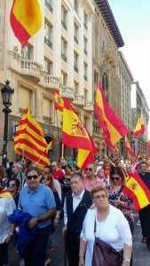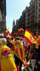 Ha sido un día mediterráneo muy soleado, pero aún así la manifestación continuaba la marcha. Han habido muchos momentos de calor y de necesidad de tomar un refrigero, pero aún así nadie ni podía por los miles de personas que habían, ni por dejar de defender la unidad, han aguantado y aguantado. Se veía en la caras sonrojecidas y sudorosas de los asistentes por la calor y las numerosas veces que se ha tenido que parar, pues era imposible continuar. Manifestación de paz, unión y solidaridad, mostrándose al golpe de voces y voces improvisadas con frases como: «Cataluña es España», «Somos catalanes y somos españoles», «Oeo oeo que viva España, España es la mejor»,»Esto también es el pueblo catalán», «España es 1 y no 51», «Viva el Rey», «Viva España», «Viva Cataluña», «Esta es vuestra España también», «España unida, jamás será vencida».